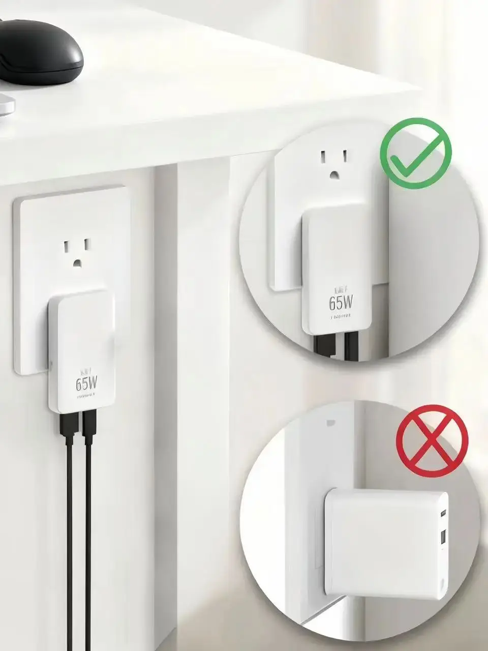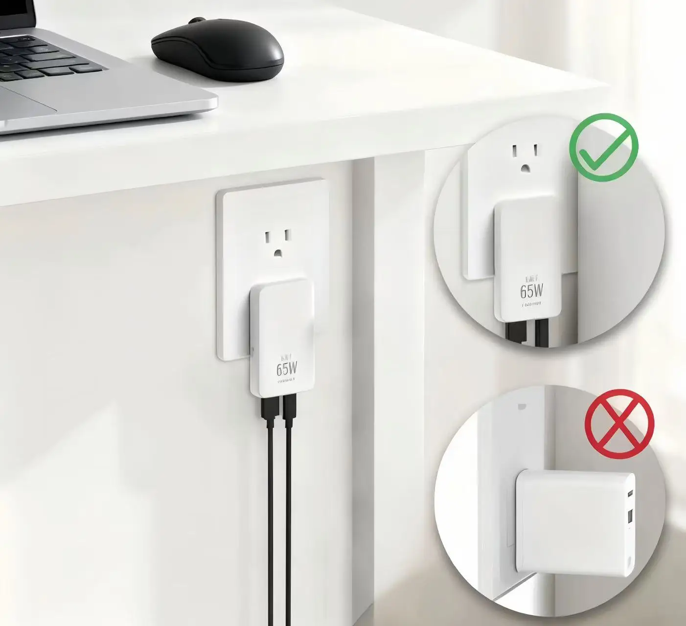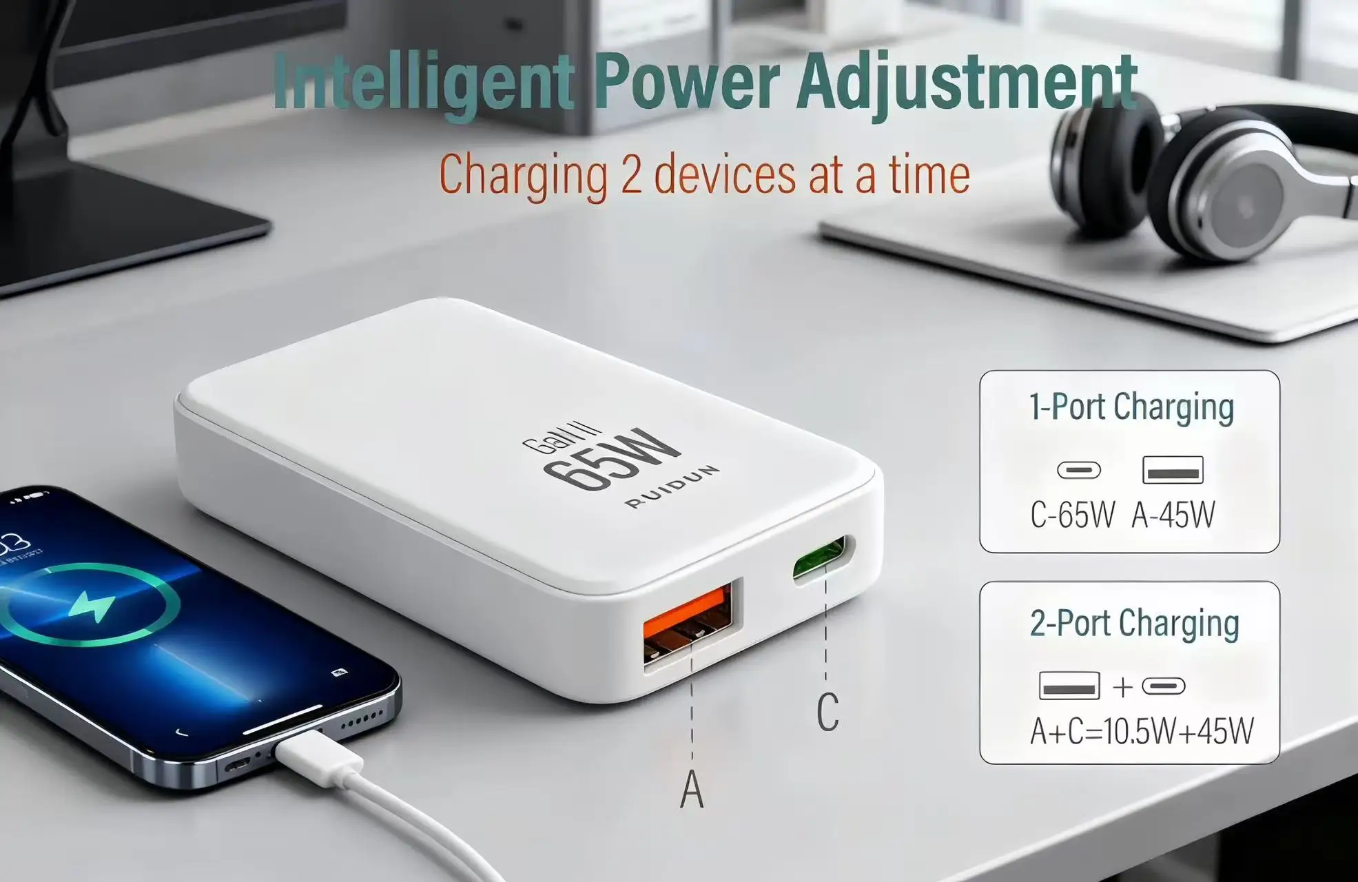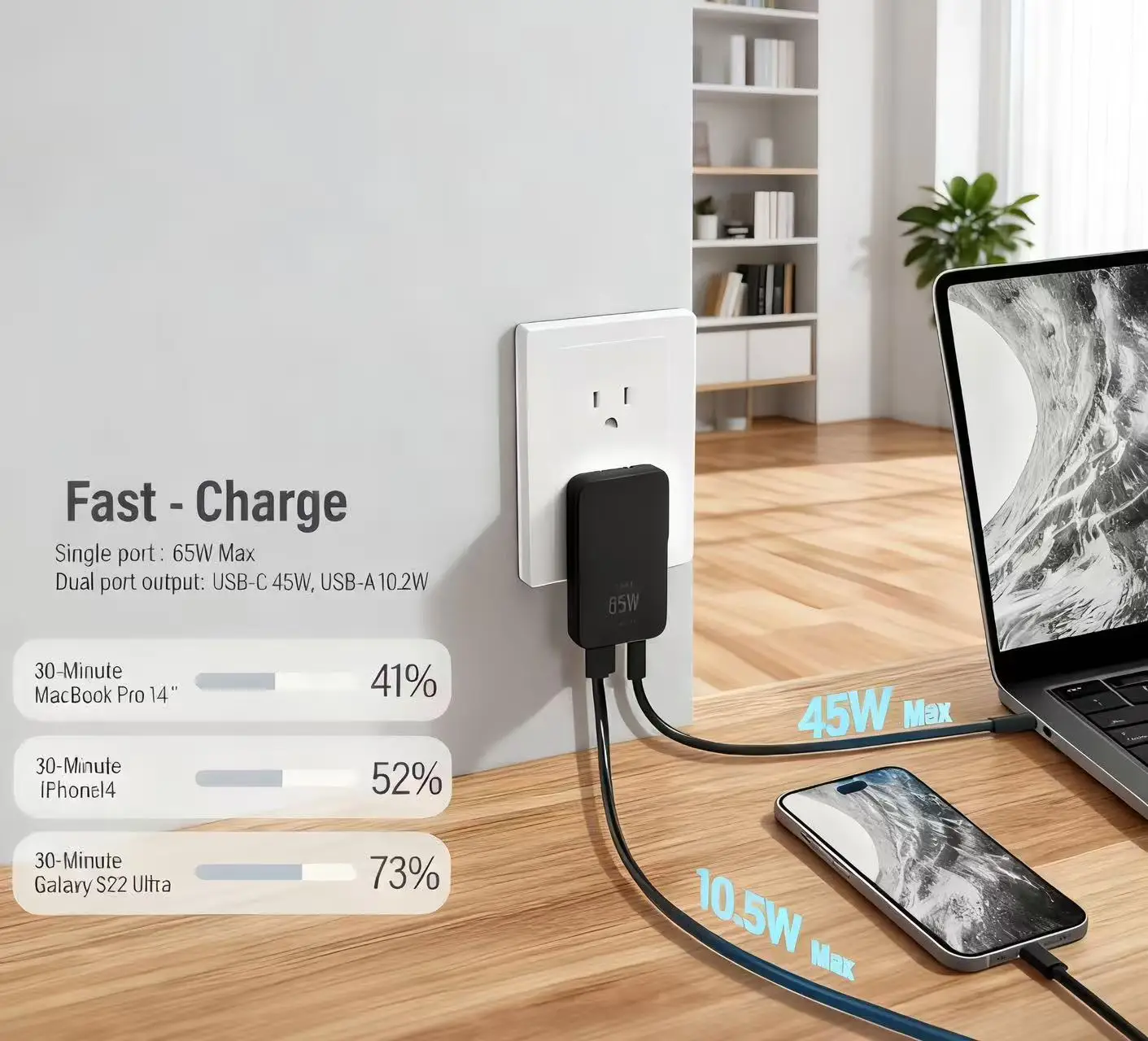 Experience rapid power-ups with the 65W GaN USB-C wall charger, ensuring your devices are charged swiftly and efficiently.